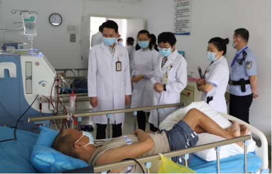 在监管区内,彭顺龙监狱长向医护一行介绍了新康监狱的整体布局及收治病犯的基本情况,并引领大家参观了监狱医院的检验室、药房、诊疗区、治疗室、抢救室等医疗区域。随后,医护一行对部分病犯进行了查房、义诊,重点对曾在监管医疗科住院的病犯进行了回访,并就下一步治疗和康复给出了专业的指导。