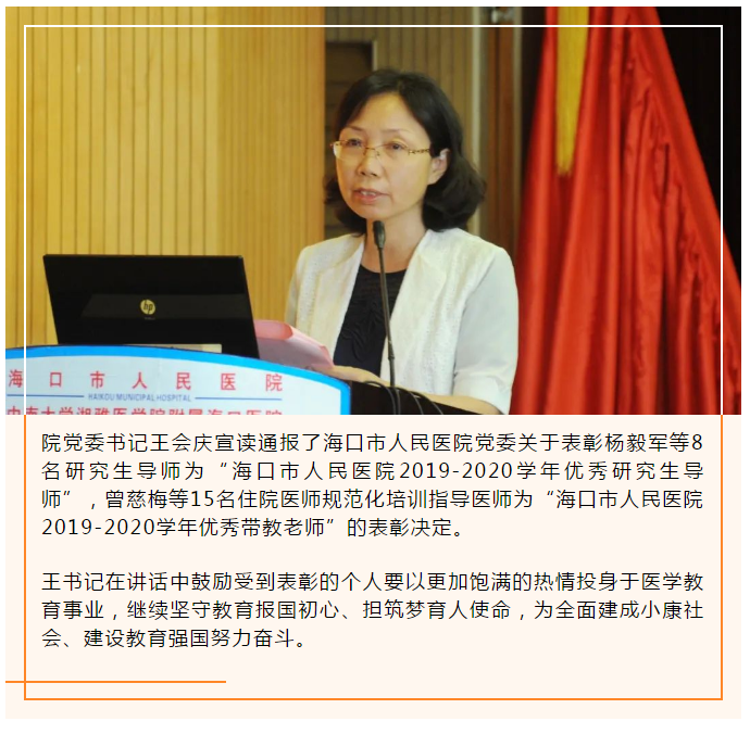 9月10日下午,色情网站 举办庆祝第36个教师节暨2020年优秀教师表彰大会,展现色情网站 医学教师立足医疗教学岗位,“立德树人,奋进担当”,守教育报国初心、担筑梦育人使命。表彰大会由副院长袁秀洪主持,医院党政班子领导、各科室主任、教研室主任、护士长、专业基地主任、轮训科室主任、教学主任、教学秘书及在读研究生、住院医师规范化培训对象代表等200多人参加表彰大会。