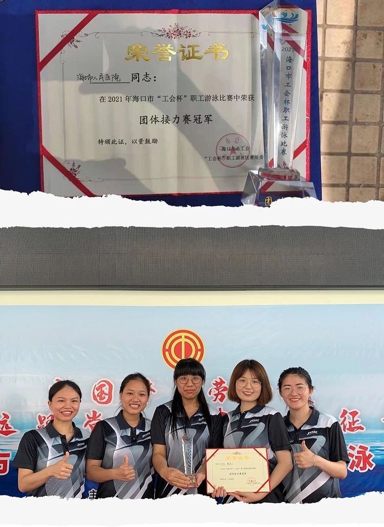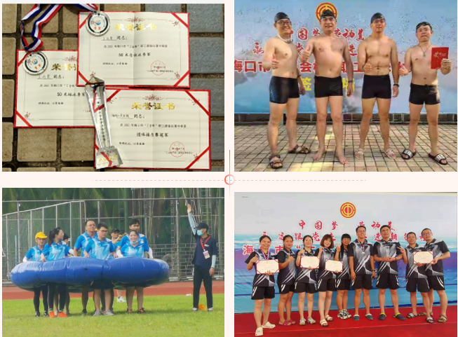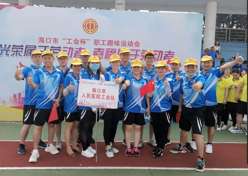 组织15名医护人员参加了海口市总工会举办“工会杯”趣味运动会,取得了优异的成绩:获女子200米接力赛团体冠军,王诗雯分别荣获50米自由泳、50米蛙泳季军,吴玉丹荣获100米自由泳季军、梁邦耀荣获“最佳拼搏奖”。