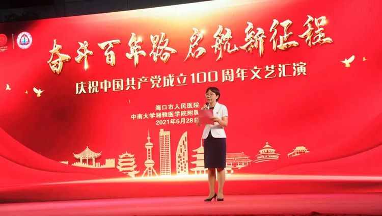院党委书记王会庆同志向晚会致辞。她说:100年来,我们党团结带领全国人民前仆后继、顽强奋斗,把贫穷落后的旧中国改变成日益走向繁荣富强的新中国,久经磨难的中华民族迎来了从站起来、富起来到强起来的伟大飞跃,迎来了实现中华民族伟大复兴的光明前景,历史雄辩地证明了中国共产党的伟大、光荣与正确,没有共产党就没有新中国。她要求全体党员要铭记党的丰功伟绩,发扬党的光荣传统,传承党的红色基因,赓续共产党人的精神血脉,不忘初心、牢记使命,奋力谱写全面建设社会主义现代化国家的新篇章。她希望全院广大党员、干部职工坚持以习近平新时代中国特色社会主义思想为指导,增强“四个意识”、坚定“四个自信”、做到“两个维护”。弘扬“敬佑生命,救死扶伤,甘于奉献,大爱无疆”的职业精神,以党的百岁华诞为新起点,勇于担当作为,抢抓海南建设自由贸易港的机遇,为色情网站