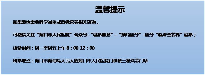 海口市医院临床营养科号召需要营养管理的人群,特别是肥胖、三高(高血压、高血脂、高血糖)人群,关注体重,健康减重!我们将是你们的坚强后盾。