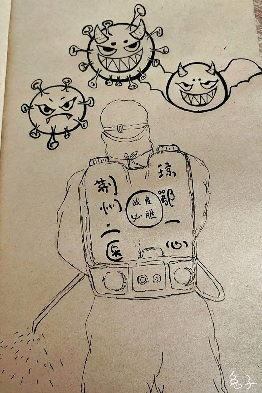 今天是来到荆州的第七天,正正好一周。当值晚班,白天的闲暇时间,就翻出了笔记本,回想这些天的工作情况,想画点什么。没有铅笔橡皮,没有专业技术,单单凭借临摹和想象,画了今天的主题人物,上消毒班的小哥哥。