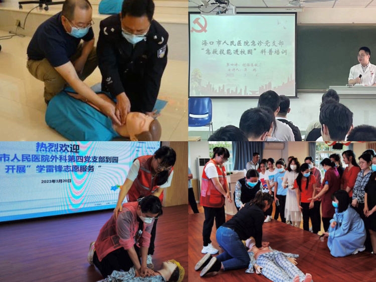 急诊科党支部、外科第四党支部、心血管内科党支部分别到海南大学、海南大学附属幼儿园和海南省三江监狱开展急救知识科普志愿服务活动。医护志愿者们通过通俗易懂的语言,充分利用教学模具详细示范了心肺复苏术+AED的使用、儿童的海姆立克急救法,通过活动,提升了群众的急救能力。